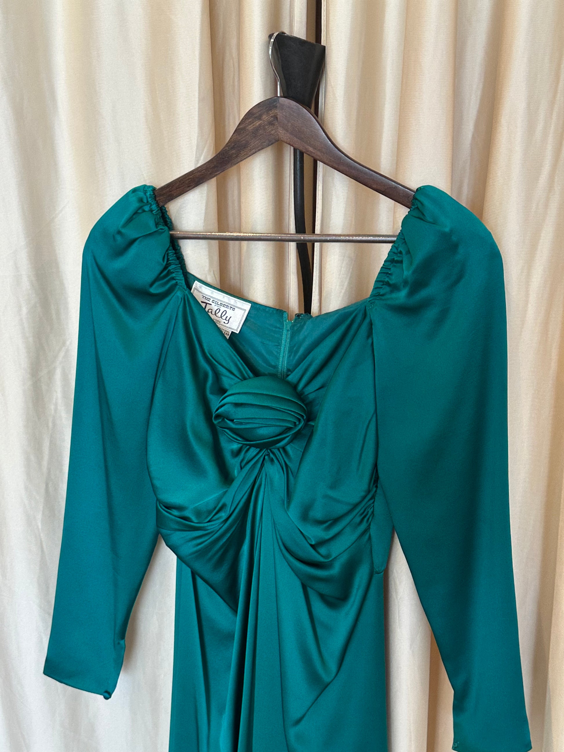 1980s emerald silk satin gown. Features a rosette detail at bust, long sleeves and a maxi length. Union Made. In excellent condition with a missing button at wrist.