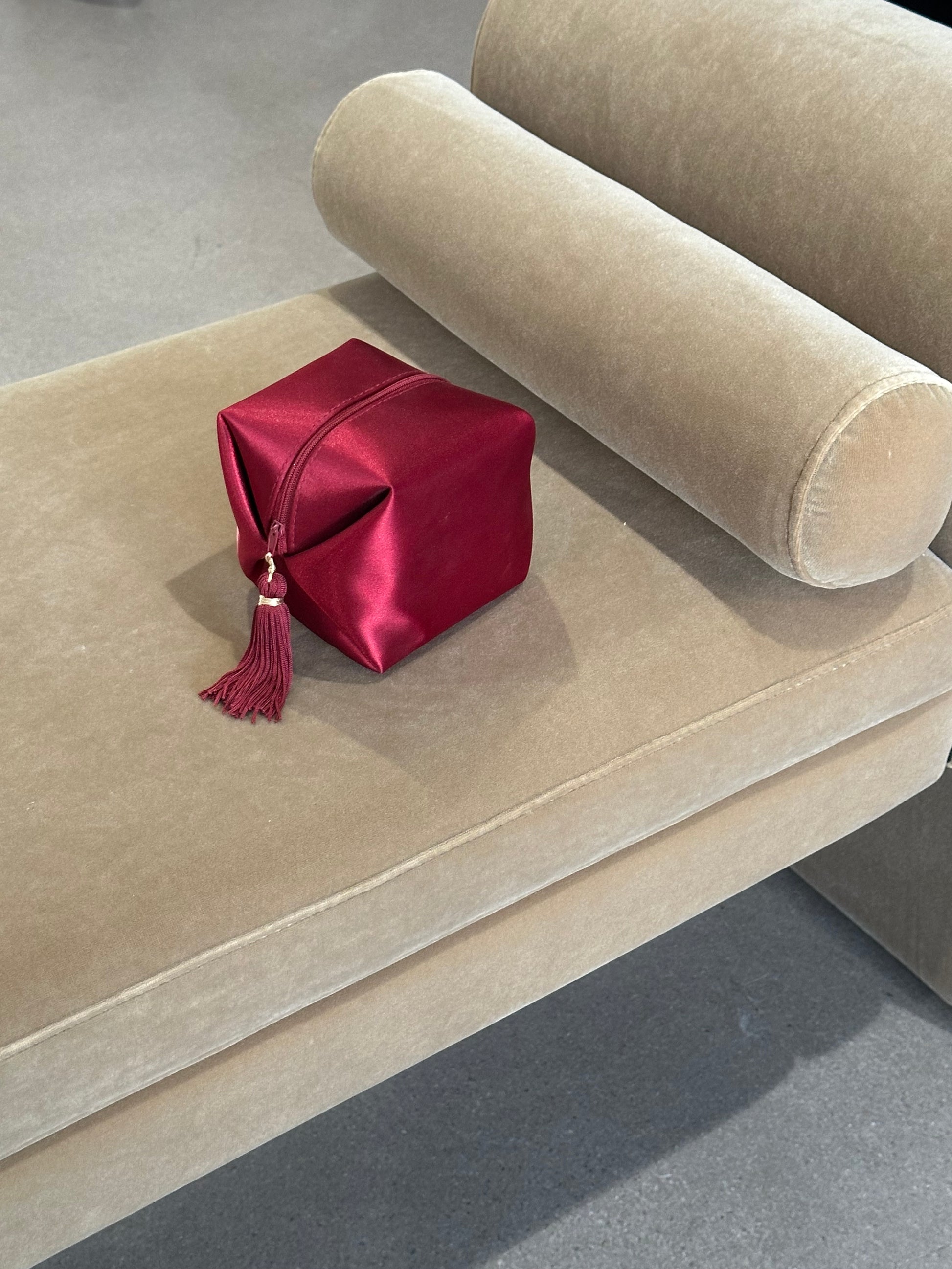 1980s red satin bag that features a tassel hanging off zipper. Clean inside and out.