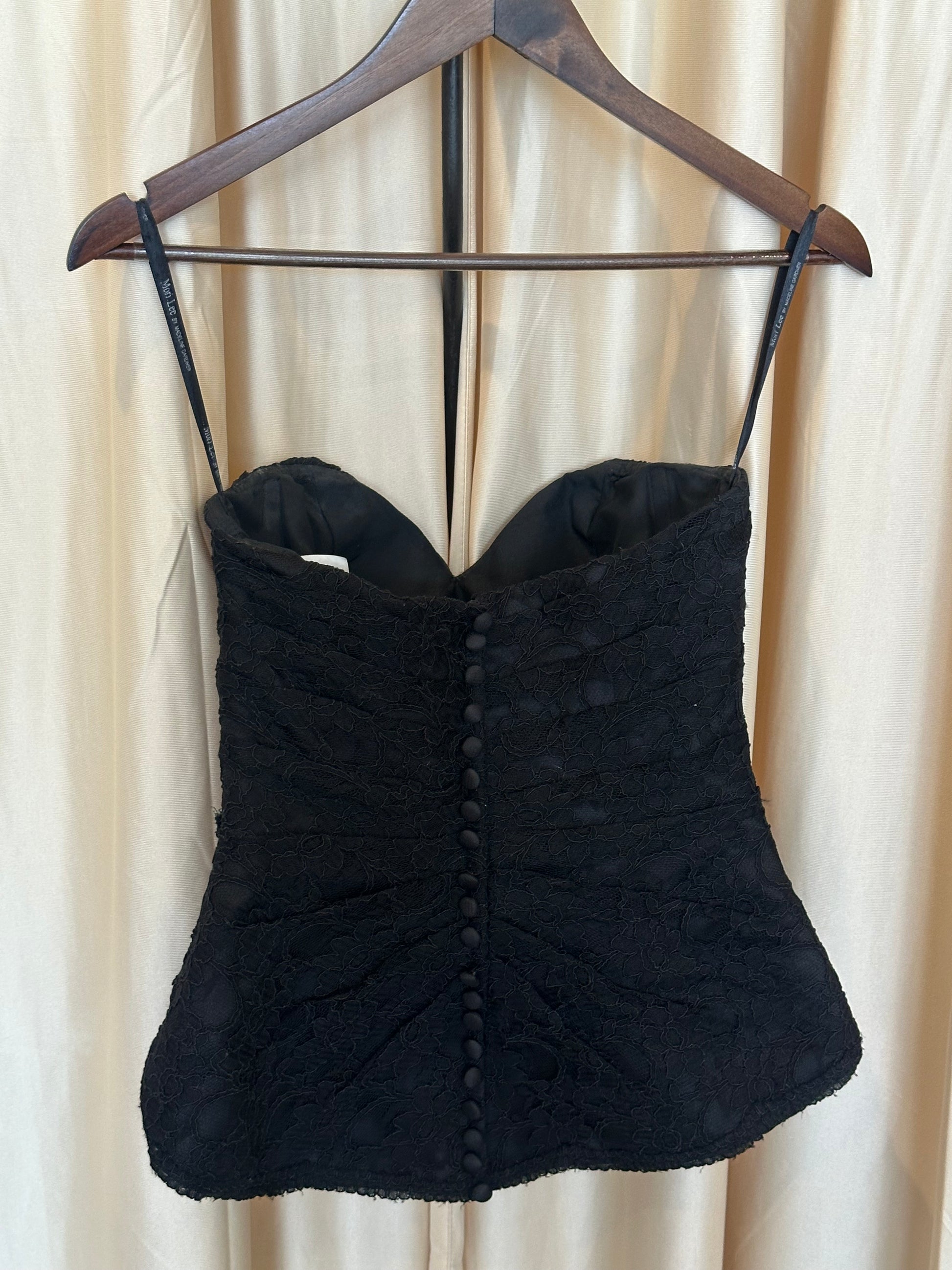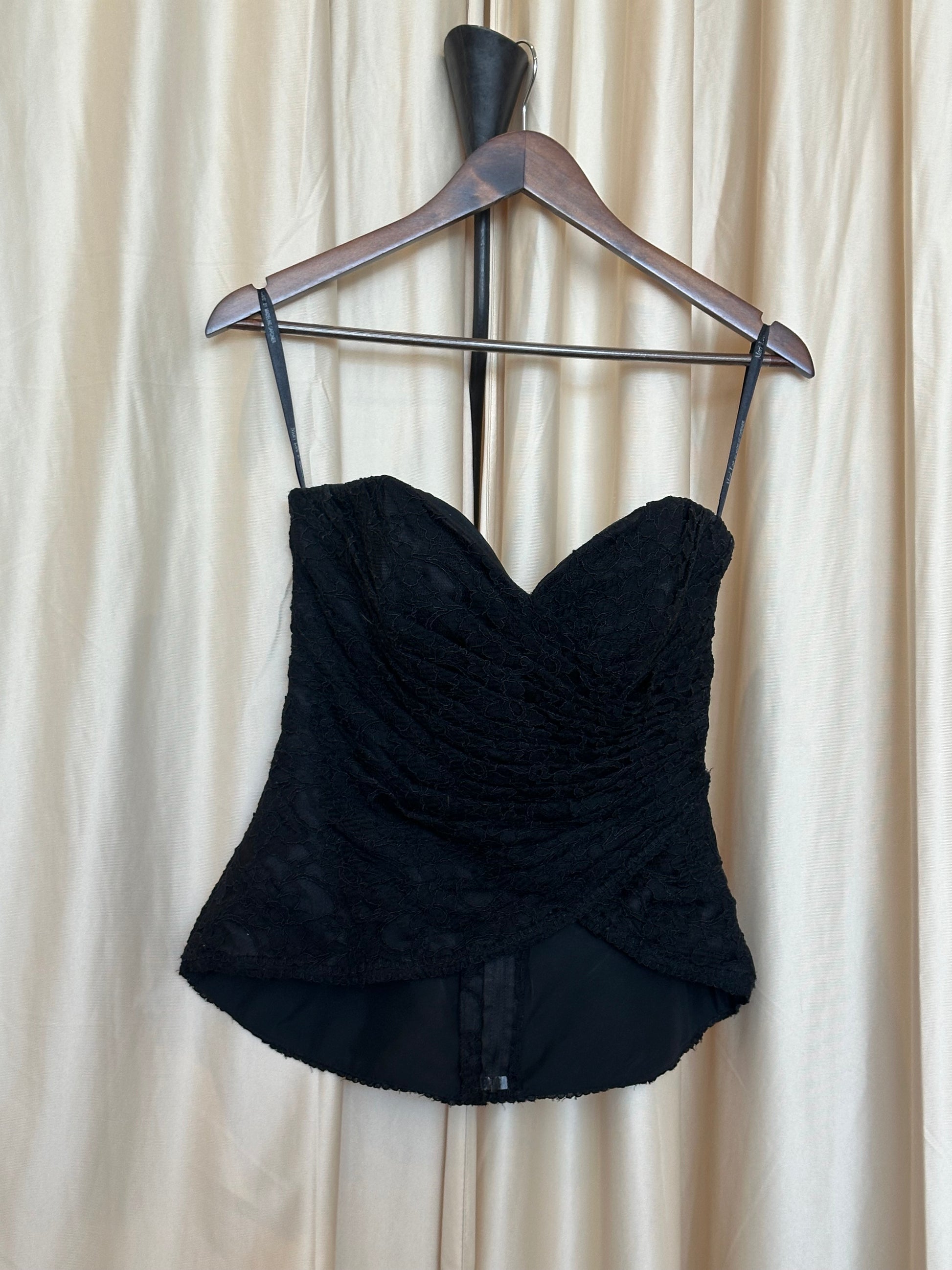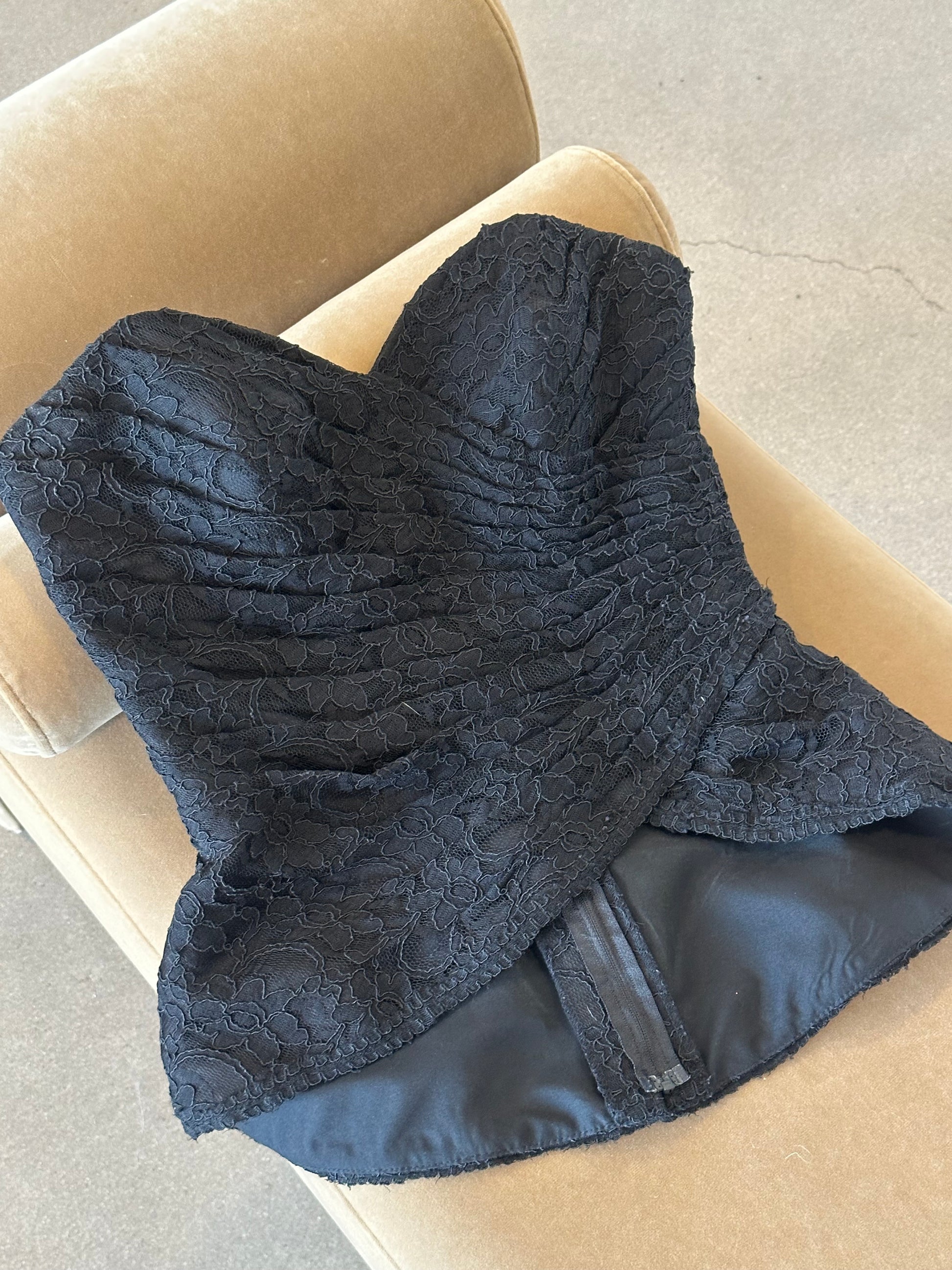 Vintage black lace bustier. Features flattering ruching, fabric covered buttons up back and hidden zipper closure. In excellent condition with no stains or rips- one small button missing on back- almost impossible to notice.