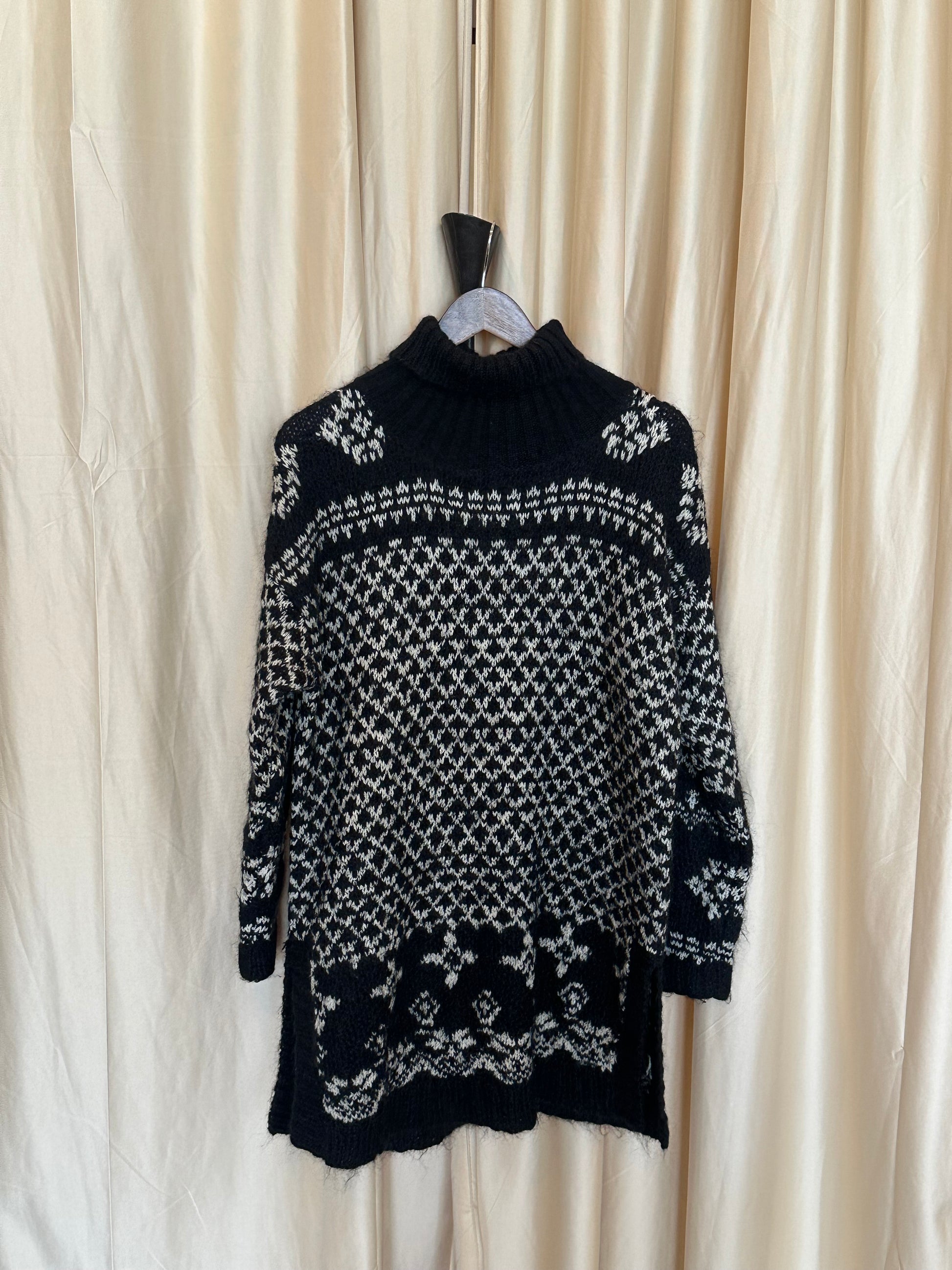 1990s sweater mini dress. Features a turtleneck , black and white print and two mini slits up sides of dress. In excellent vintage condition with no rips tears or stains. Size small/ medium