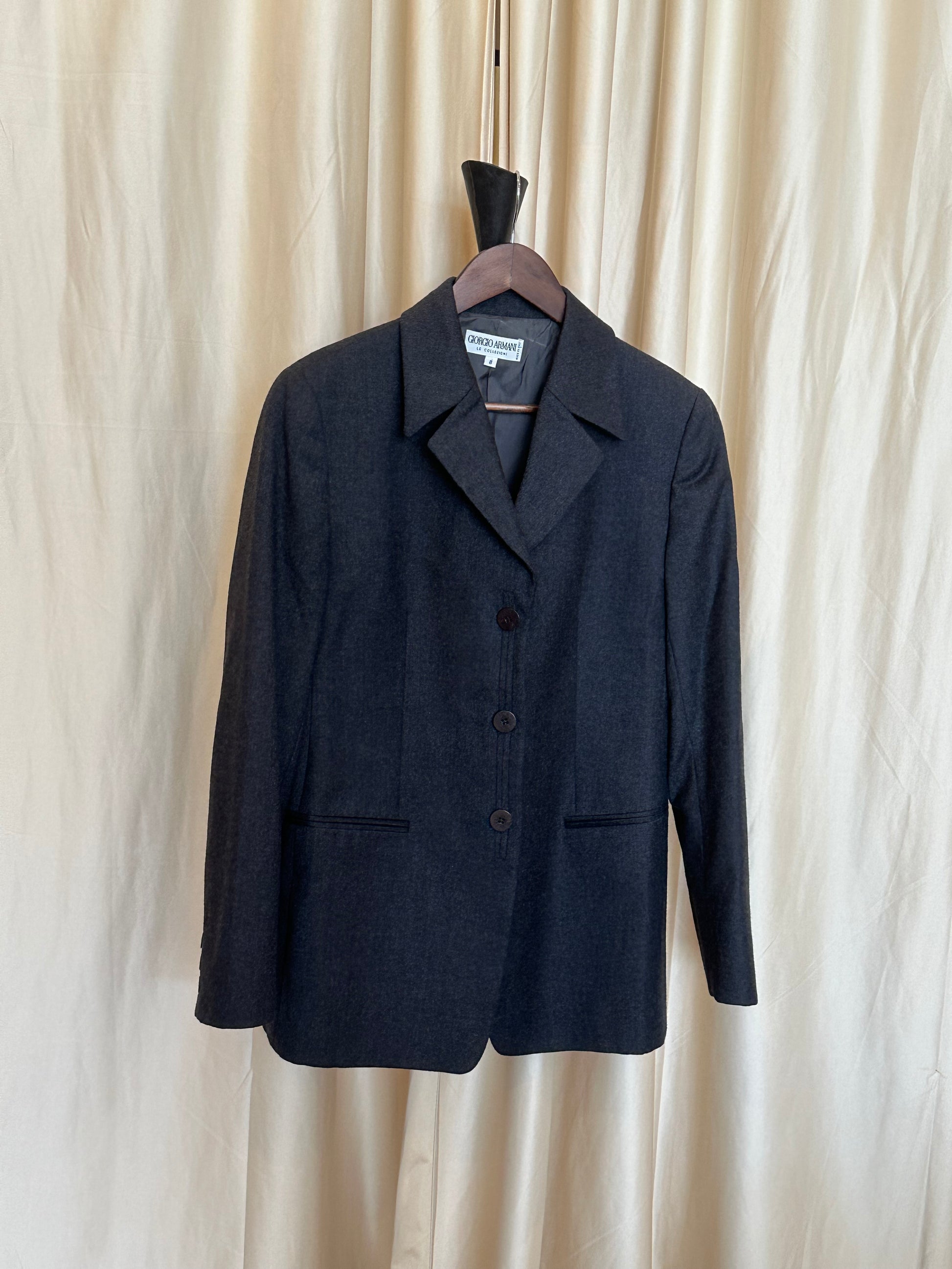 Vintage Giorgio Armani Le Collezioni gray wool blazer. Features a collared neckline, and button closure up front. Excellent vinatge condition no rips tears or stains.
