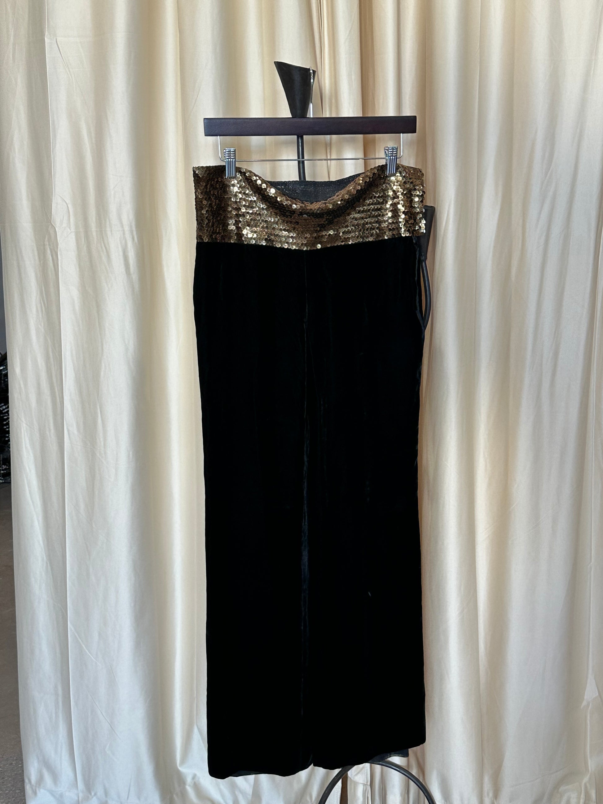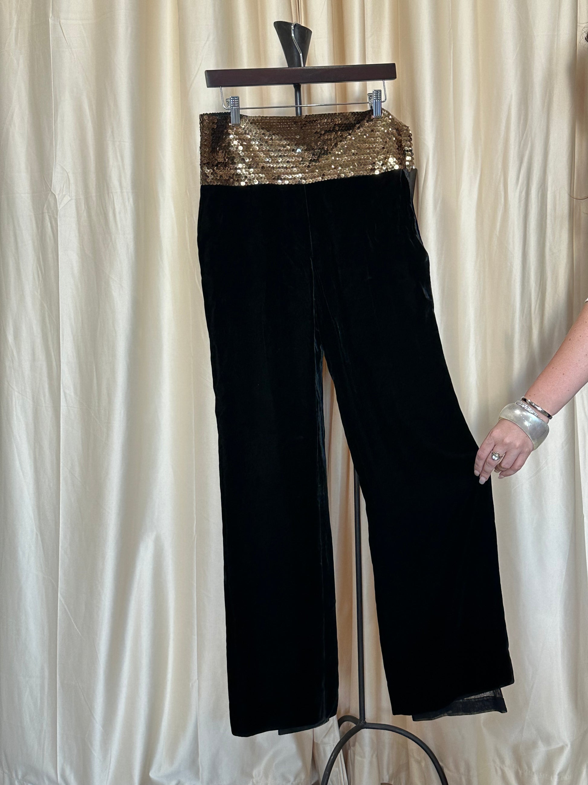 1998 Spring/ Summer Chloe trousers as seen on Madonna on the Ray of Light album cover and music video. Features a black velvet fabric with a gold sequin cummerbund. In excellent condition with no rips tears or stains.