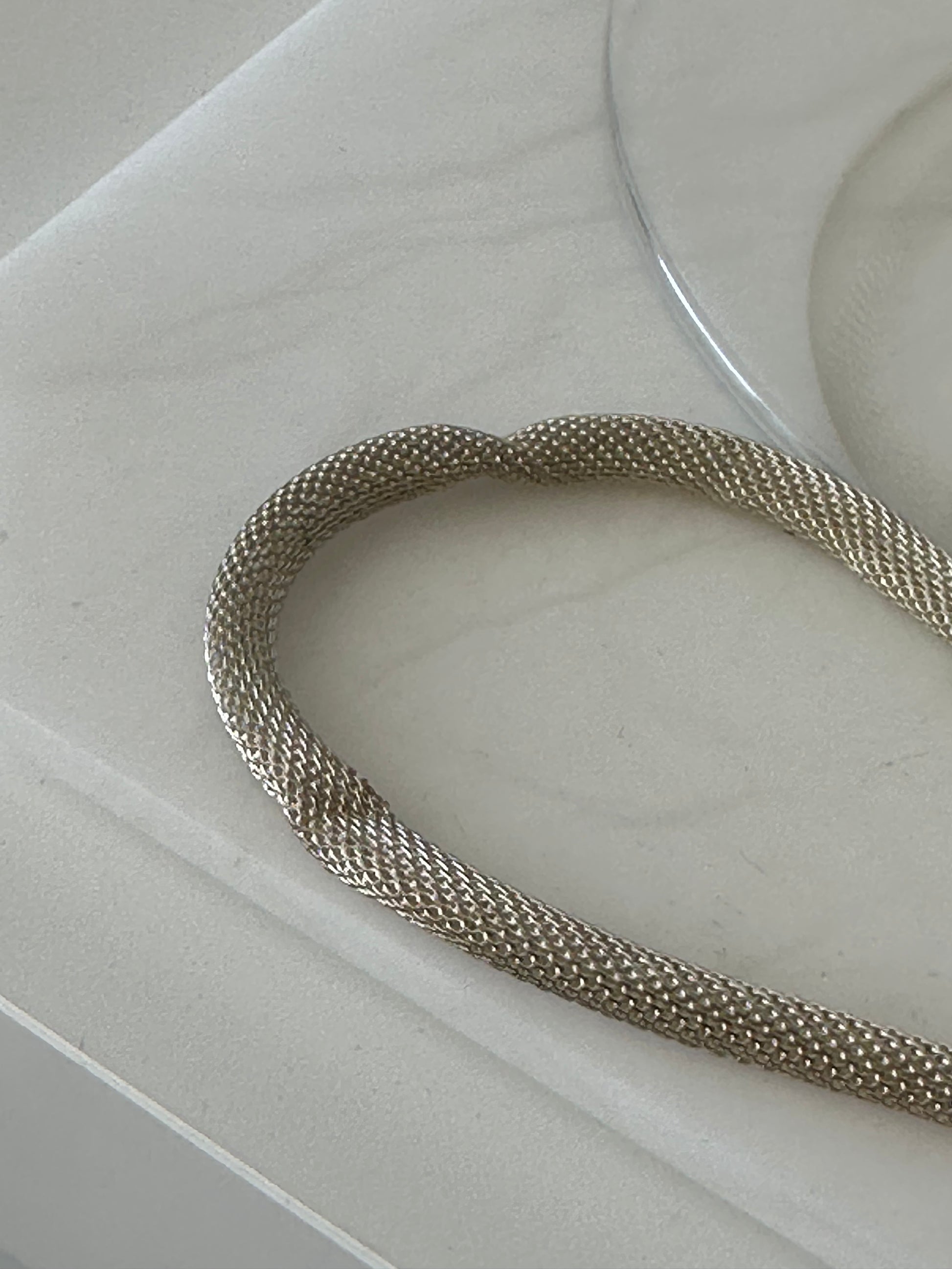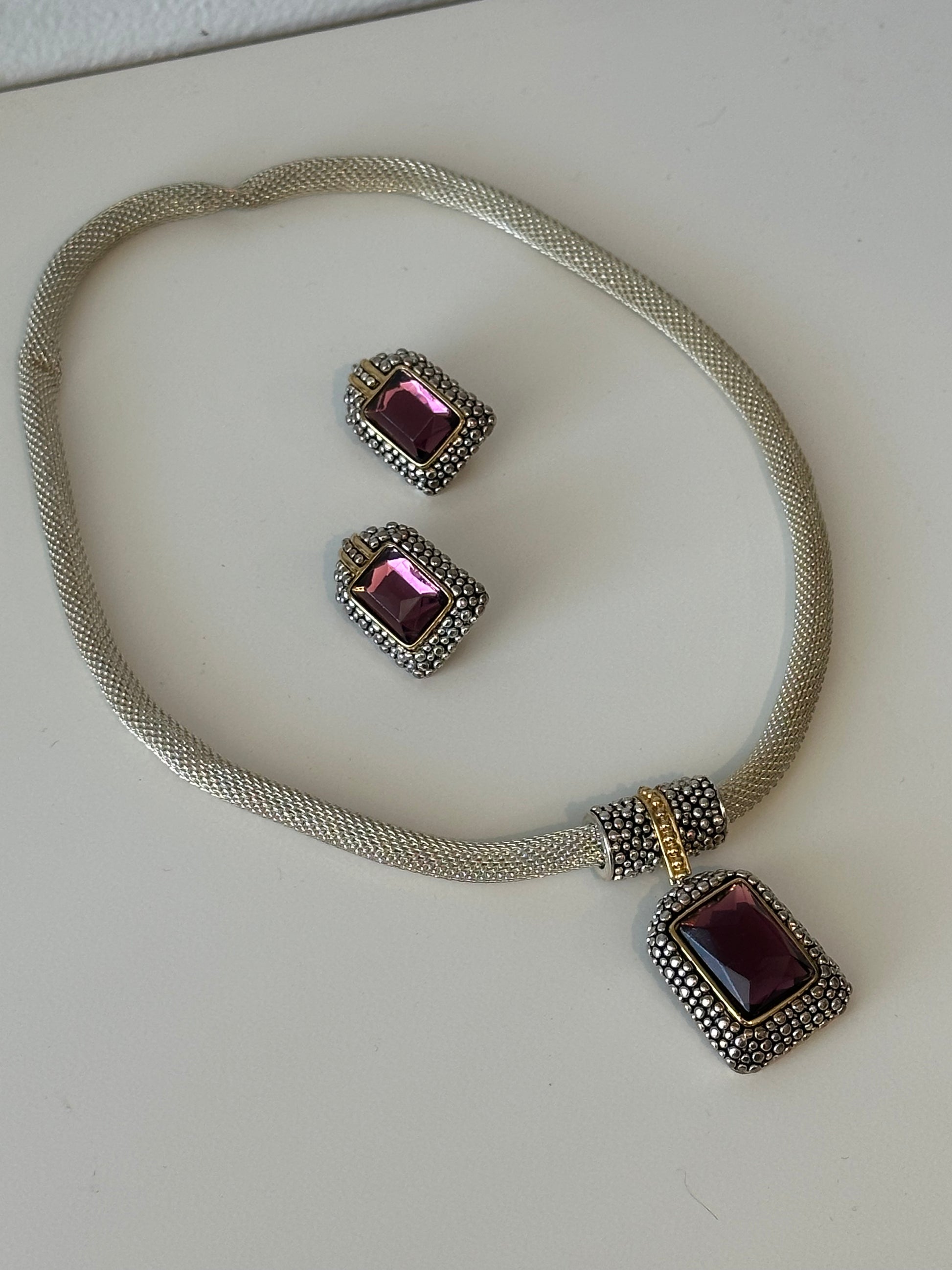 Premier Designs jewelry pendant and earrings set. featuring a silver-tone mesh chain with a large rectangular purole glass pendant and matching clip-on earrings. Chain is pinched in two pieces- see photos