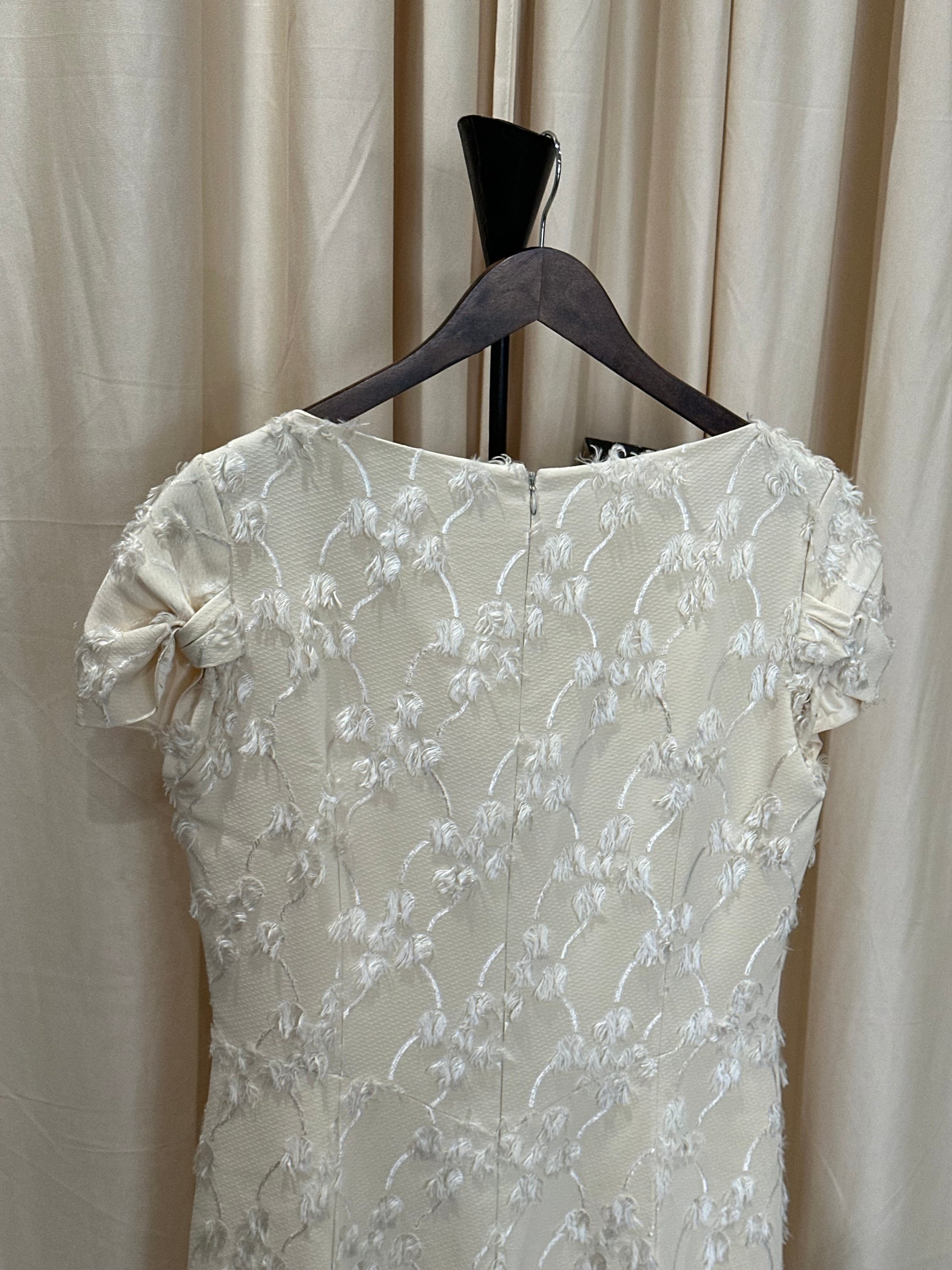 John Galliano cream sheath dress with a bateau neckline. Features a textured pattern of 3D organic appliqué and a loop detail at the back of sleeve. In excellent condition with no rips tears or stains .