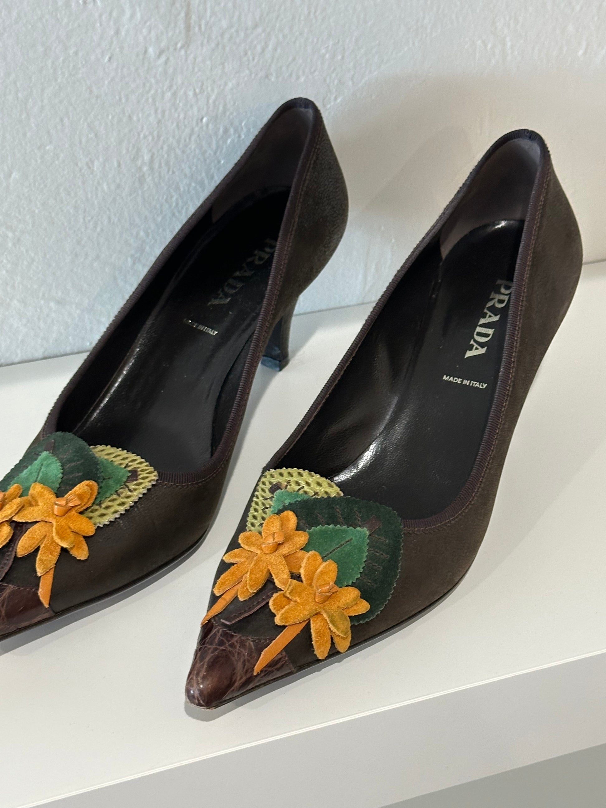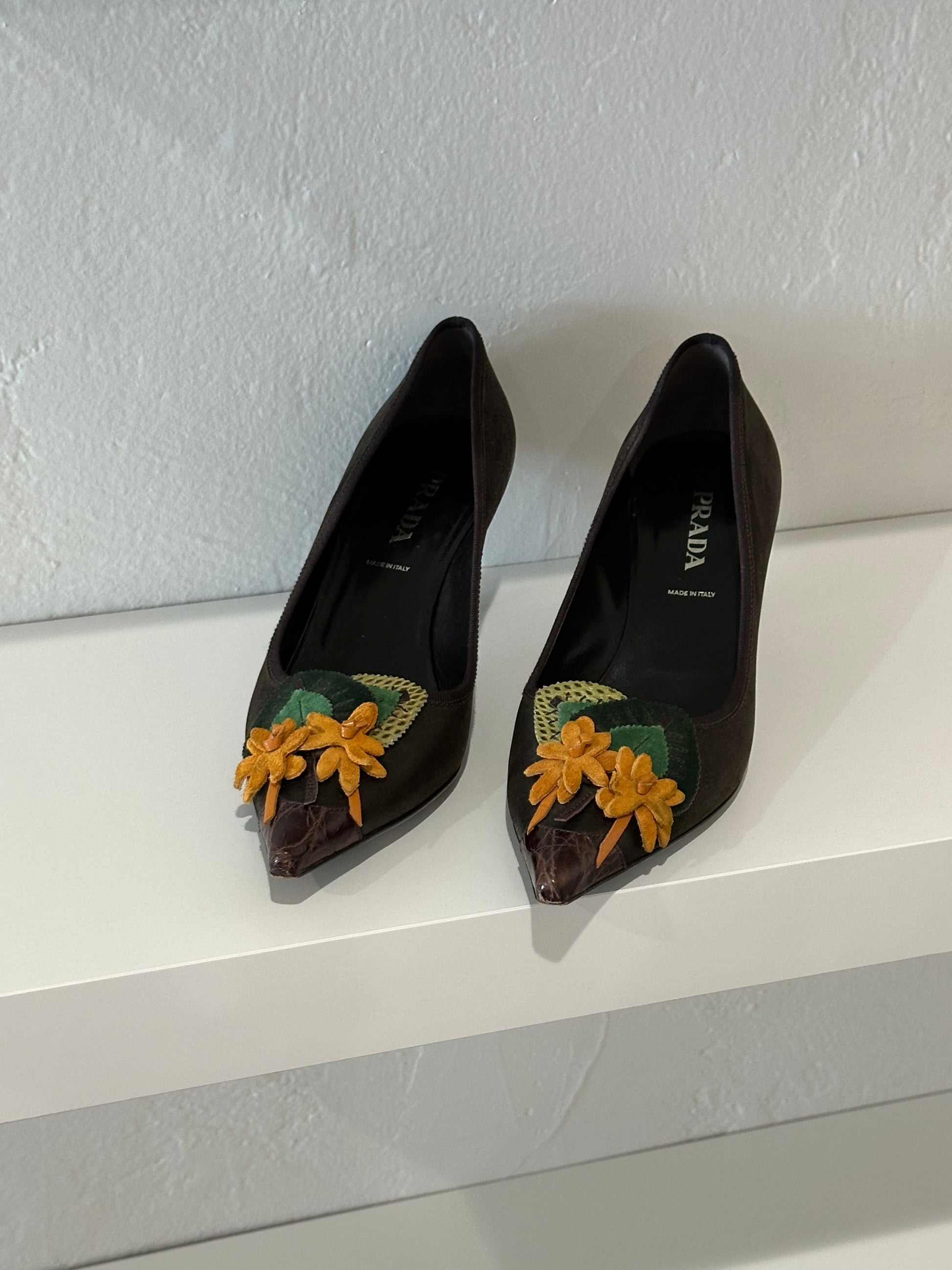 Brown leather Prada heels. Features a floral appliqué on toe, and kitten heels with 2.75” in heel. In excellent condition with some wear at sole.