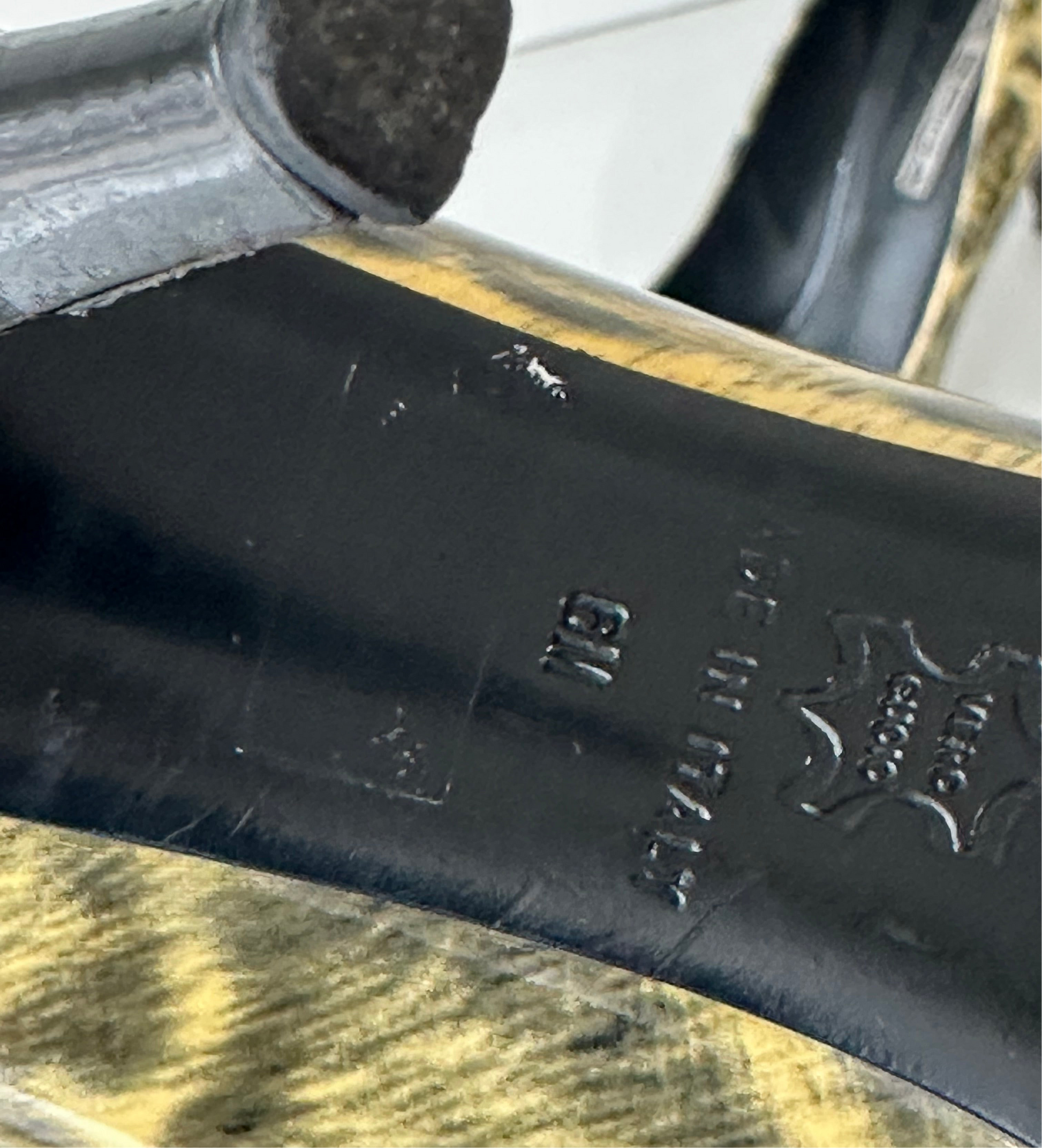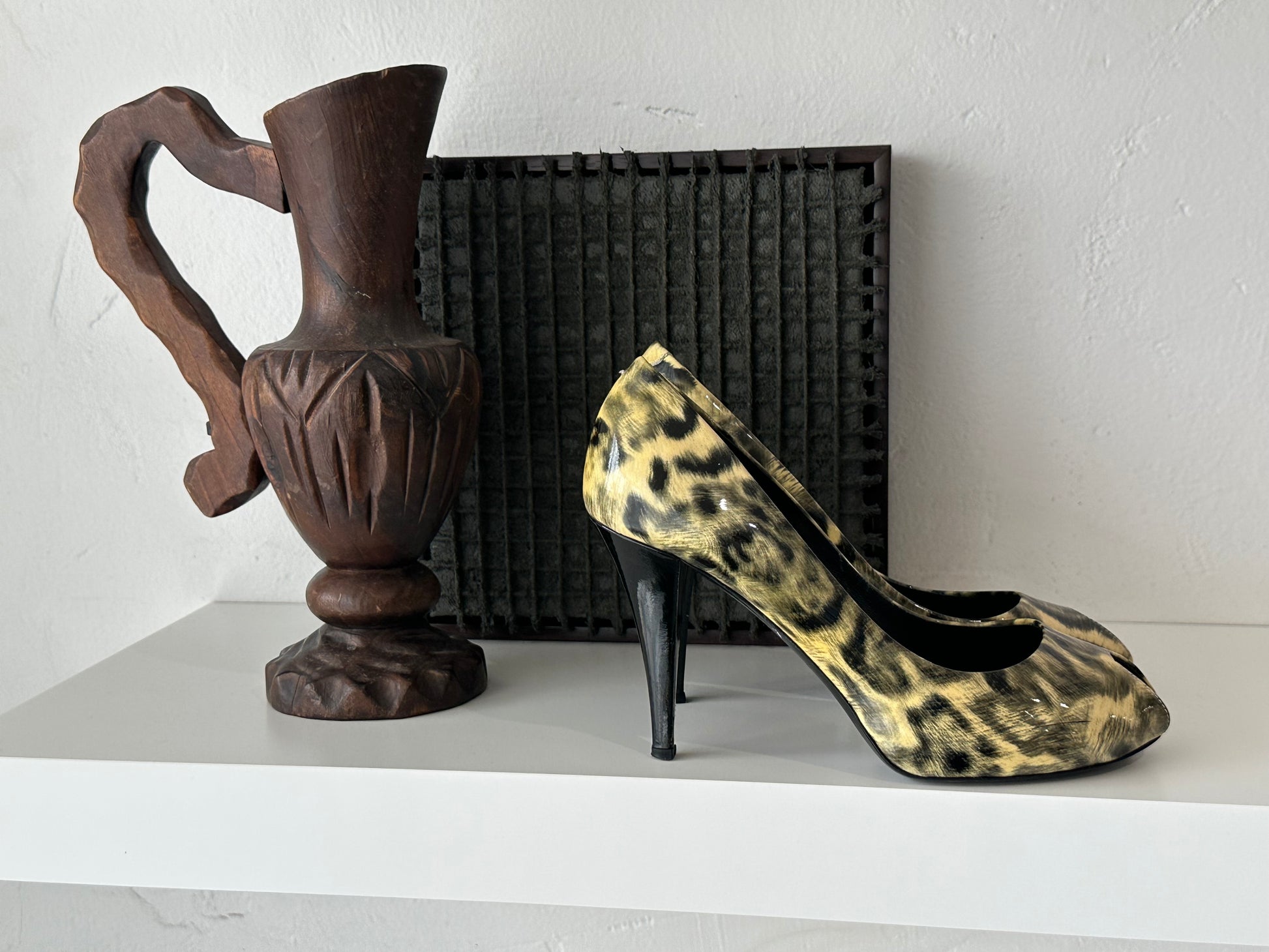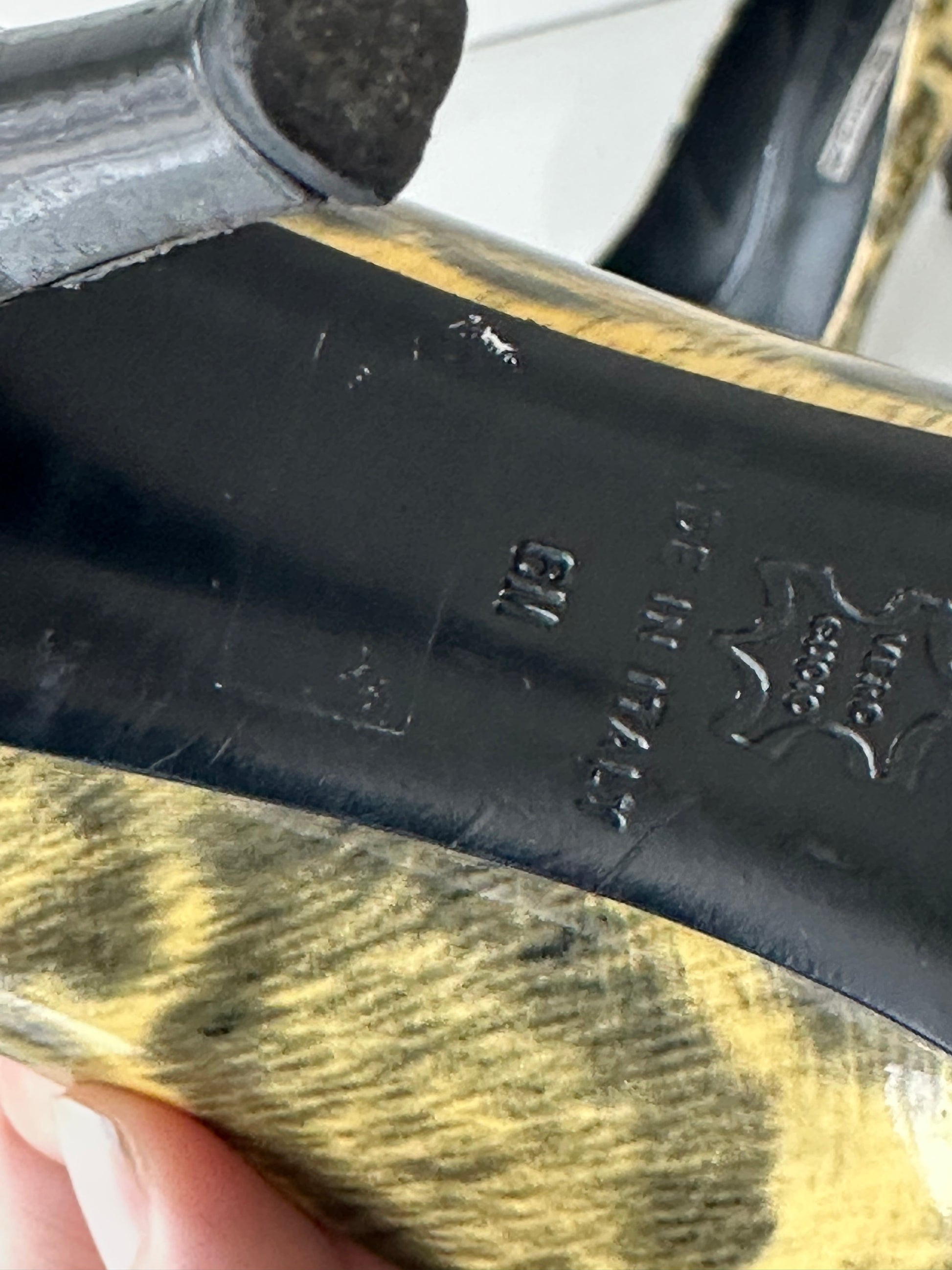 Via Spega leopard print heels with a peep toe and a 4 in heel. In great vintage condition with a little wear at shoe bed and sole.