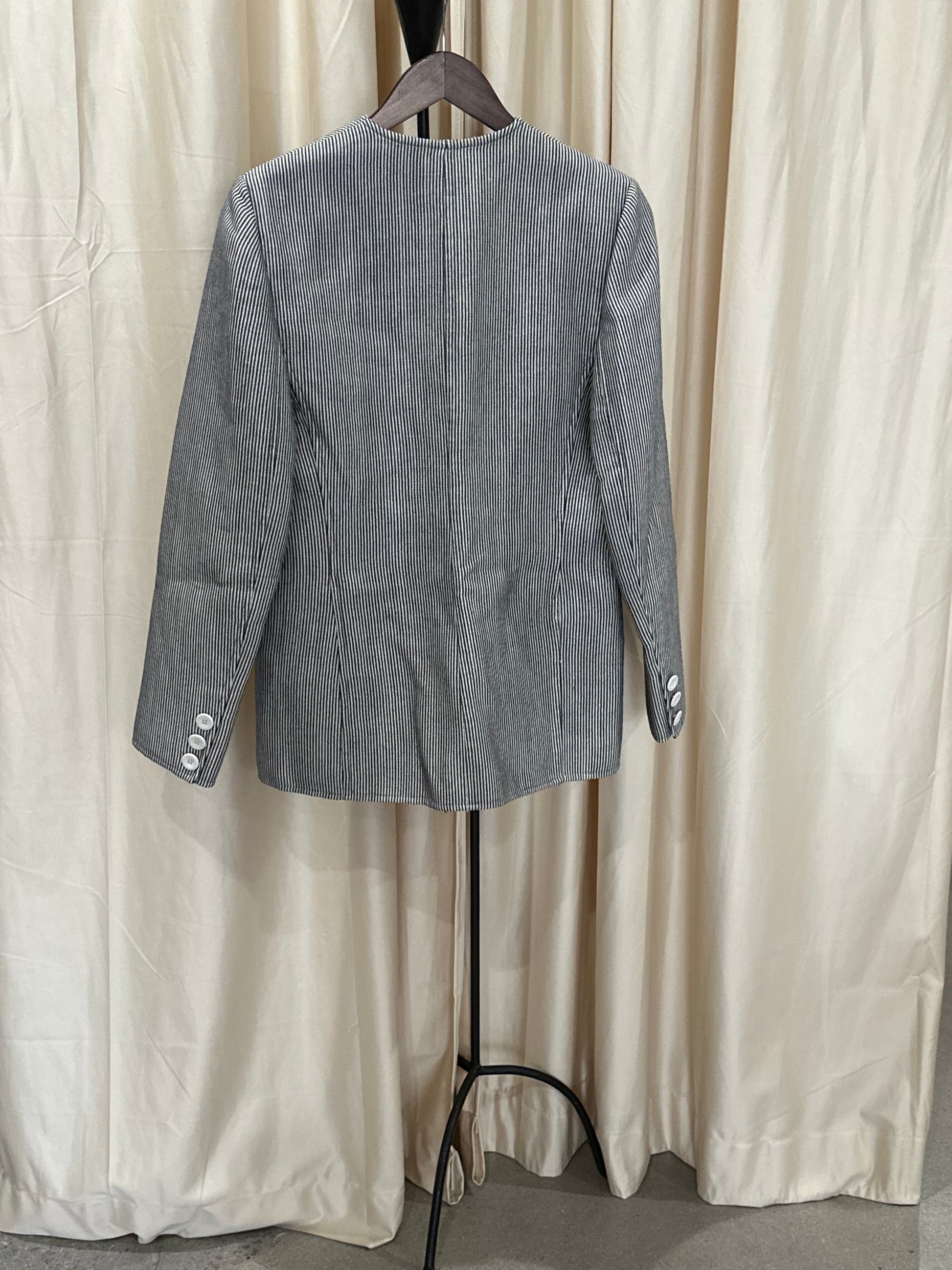 Vintage Oscar De La Renta collarless striped blazer. Features white button closure down front and at wrists. Fully lined. no fabric tag but feels like wool. In excellent vintage condition with no rips tears or stains.